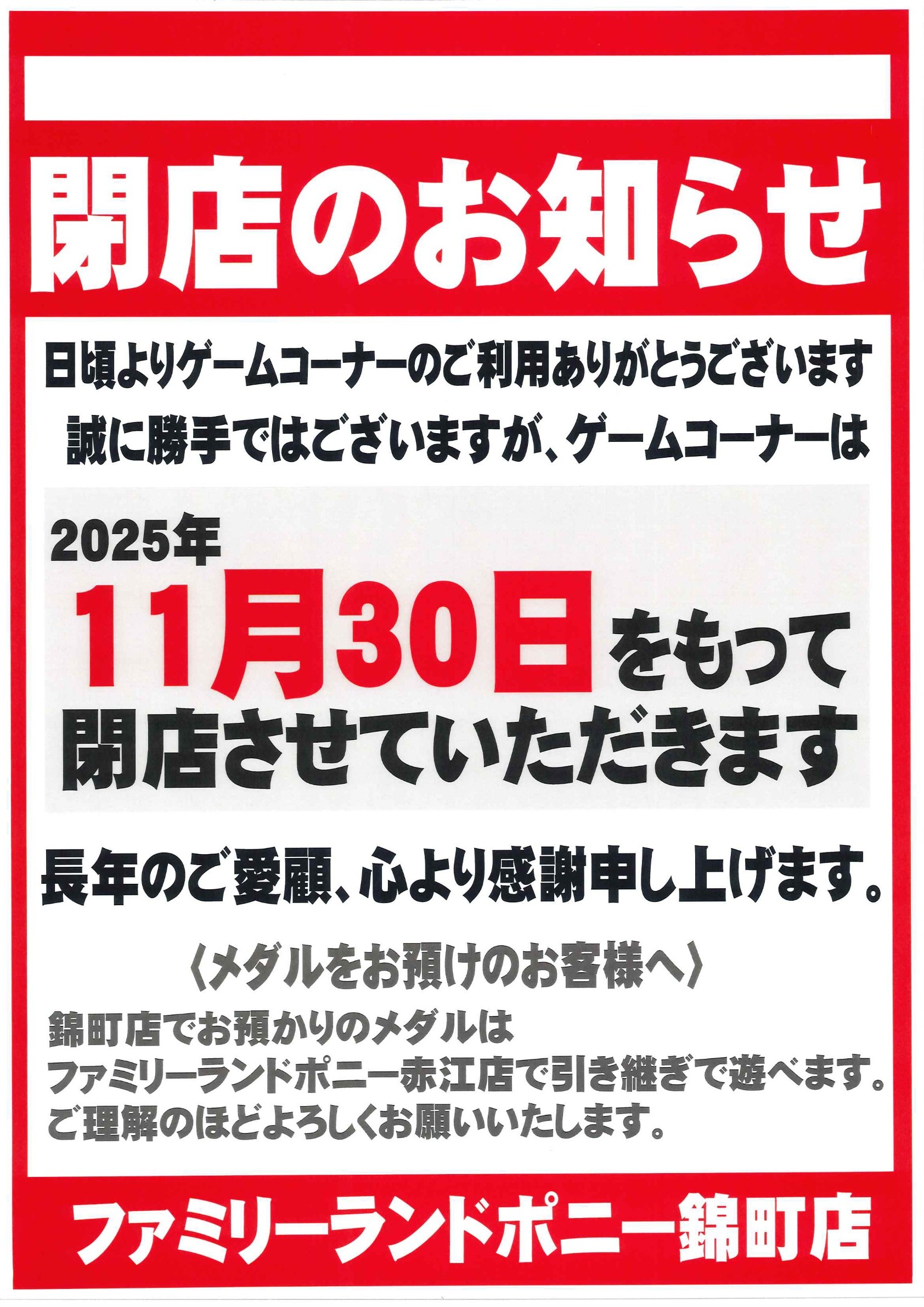 ポニー錦町店 閉店のお知らせ