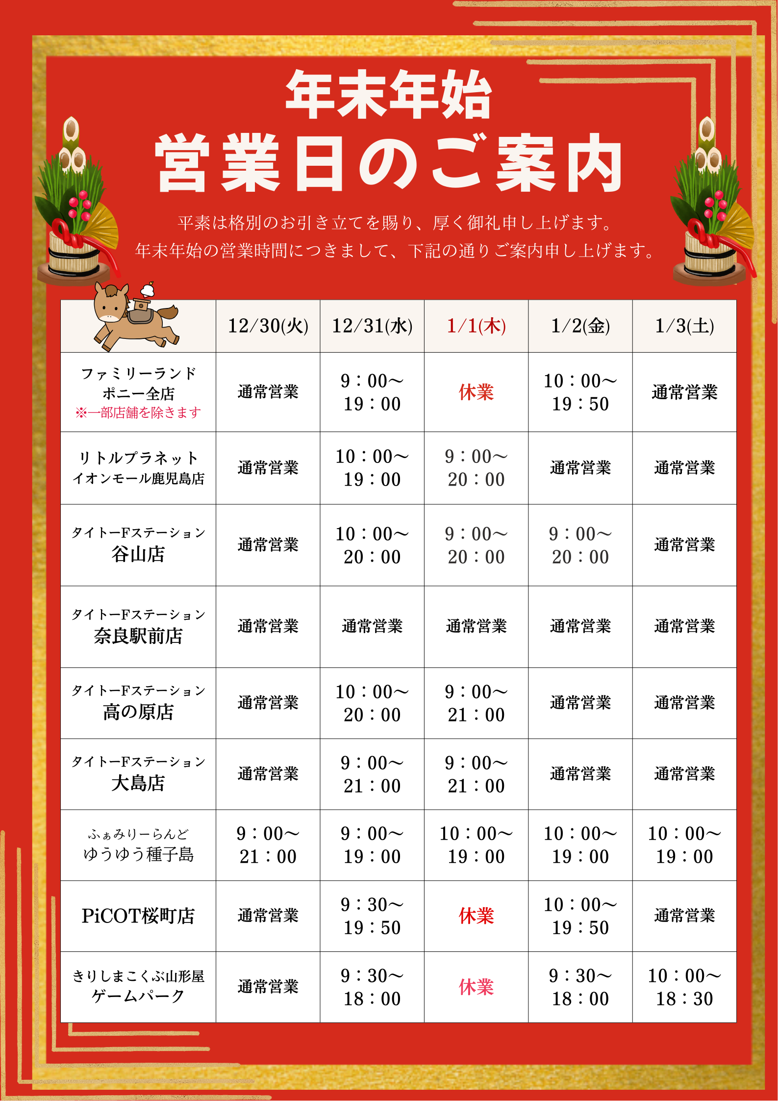 年末年始 営業時間のお知らせ